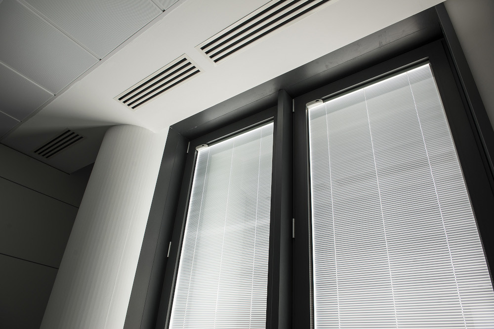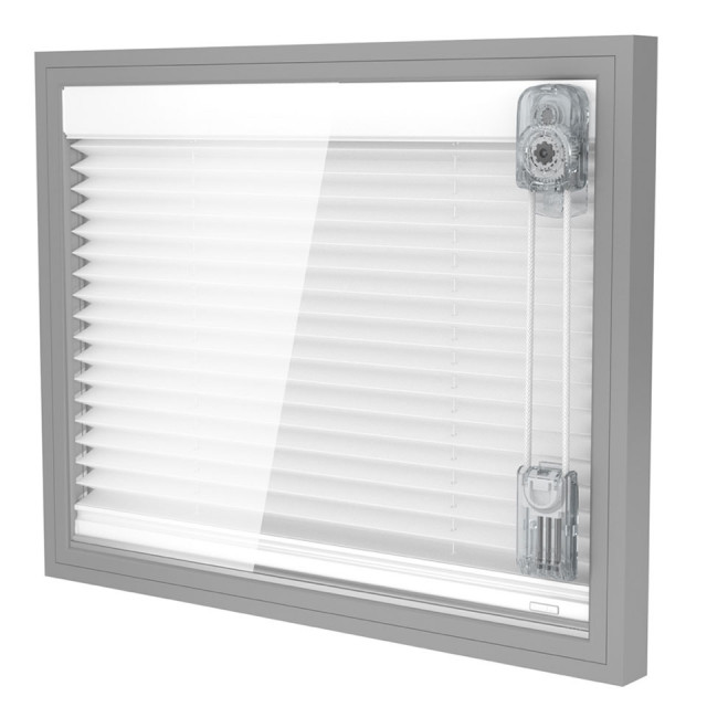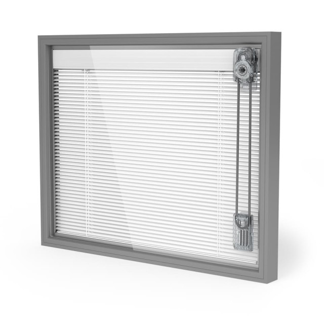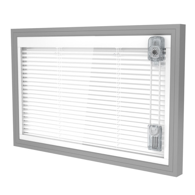 The “C” system utilises the force produced by two coupled rotational magnetic devices to raise and lower (and tilt, in venetian models) the blind by means of a cord loop. One set of magnets is located inside the blind head rail and the other one applied to the external glass surface, thus guaranteeing the perfect integrity of the insulating glass.