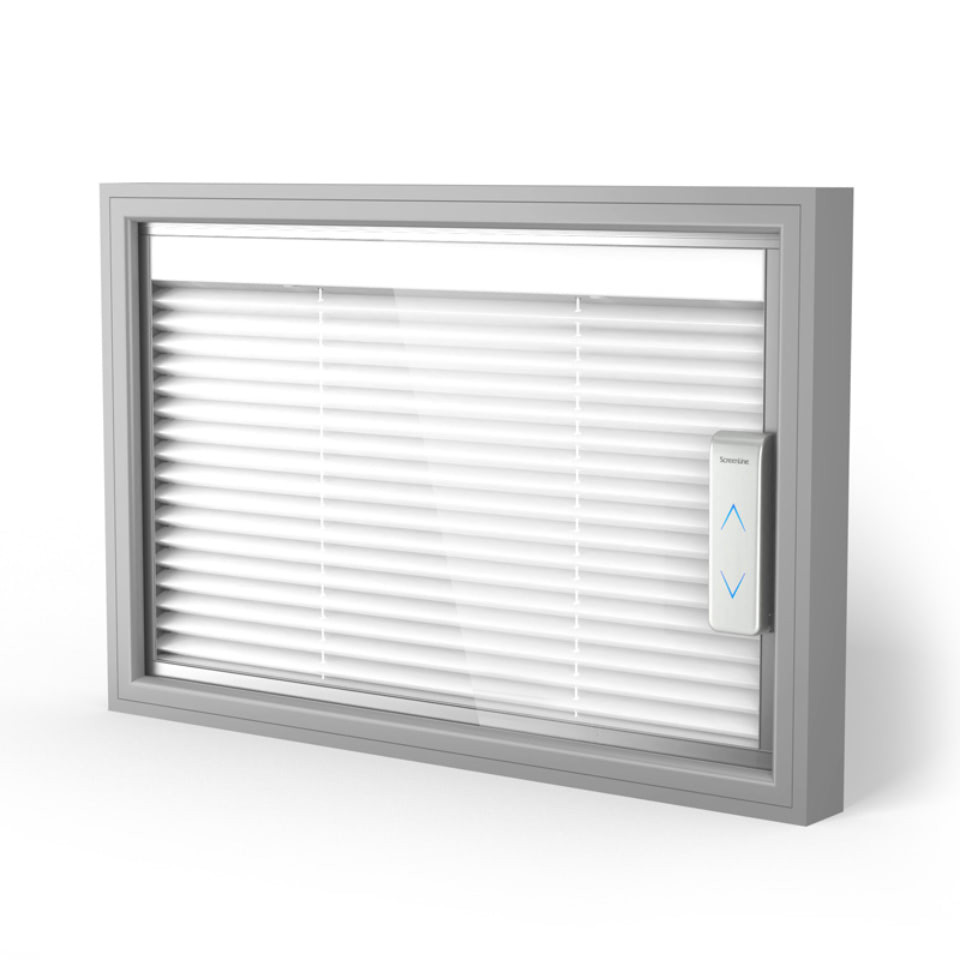 ScreenLine® SL27-29-32W is a battery-operated motorised system with raising function for pleated blinds incorporated within 27-mm, 29-mm or 32-mm insulating glass units and featuring Verosol® fabrics, which are coated with an aluminium layer on one side, or Vanity fabrics.
