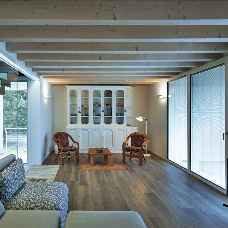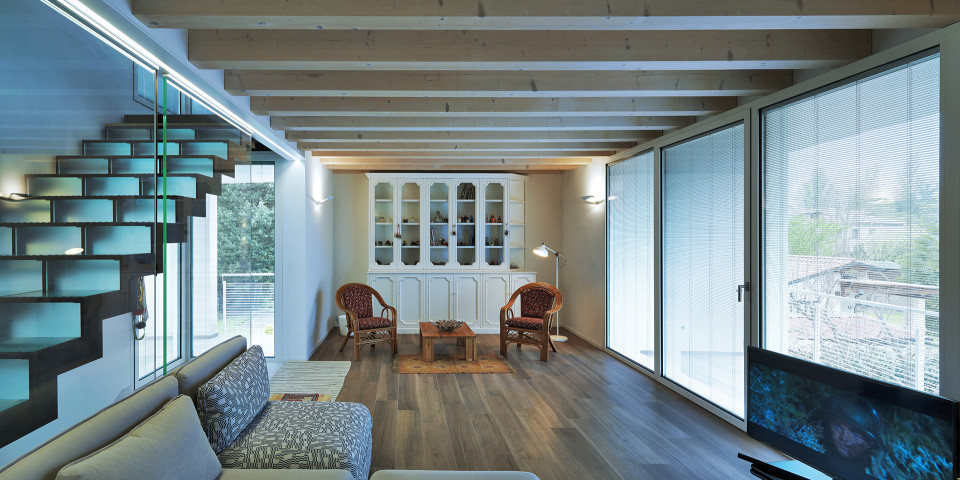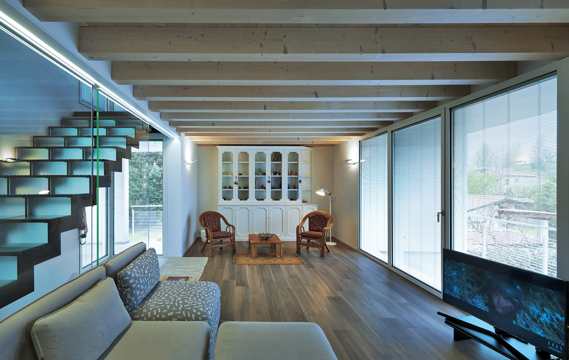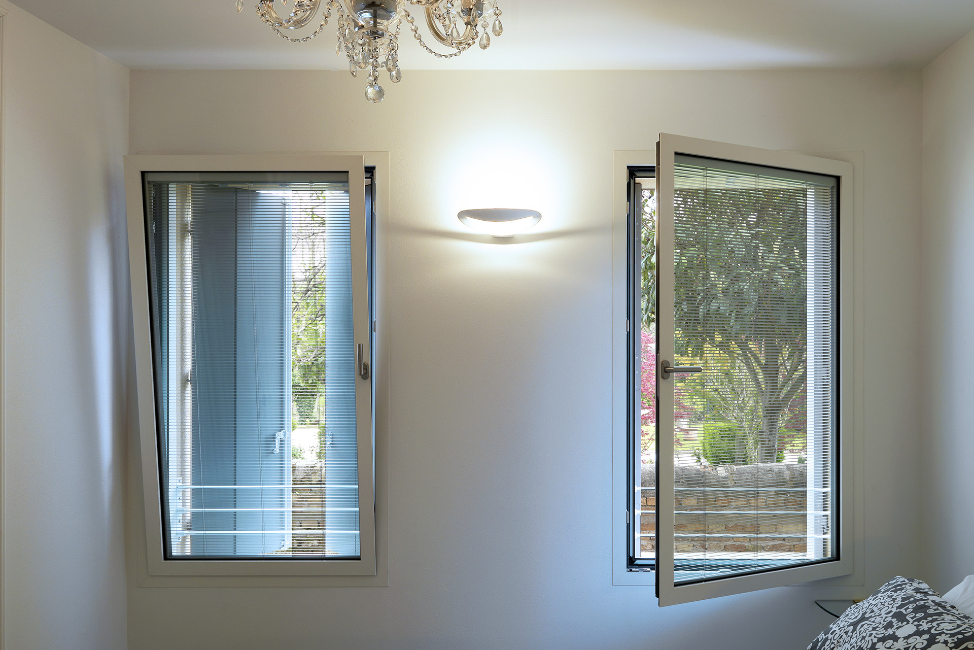 The motorised system allowed the installation of the venetian integral blinds in tilt and turn windows placed in the upper part of the wall along which the stairs lead to the upper floor, allowing the movement of the blinds where where it would be difficult to arrive manually.